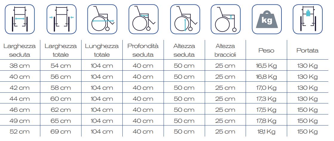 Disponibili nelle misure di seduta da 38 a 52 cm con telaio a doppia crociera e portata con portata, per le misure da 46 a 52 cm, aumentata fino a 150 Kg.