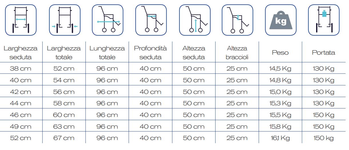 Disponibili nelle misure di seduta da 38 a 52 cm con telaio a doppia crociera e portata con portata, per le misure da 46 a 52 cm, aumentata fino a 150 Kg
