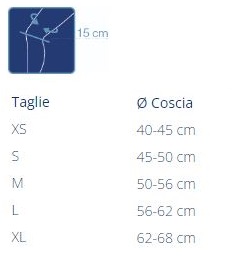 Misurare la circonferenza della coscia 15 cm. al di sopra del centro del ginocchio con la gamba leggermente flessa.