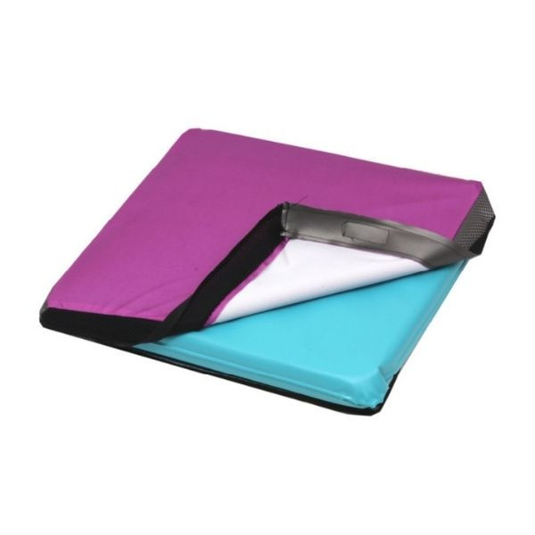 Cuscino antidecubito realizzato in gel fluido e da una base in poliuretano espanso, il tutto contenuto in una sacca di PVC.