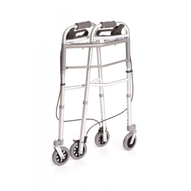 Deambulatore in lega leggera pieghevole, con 4 ruote e freni, regolabile in altezza.