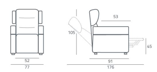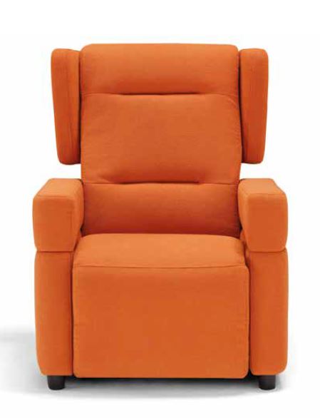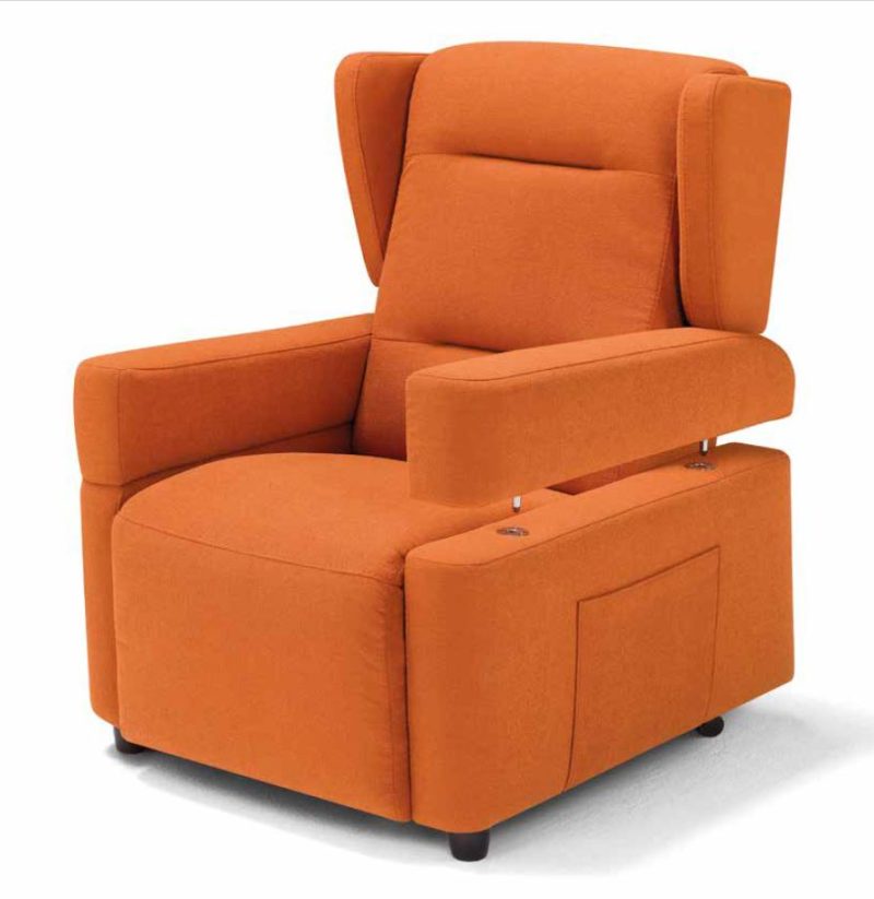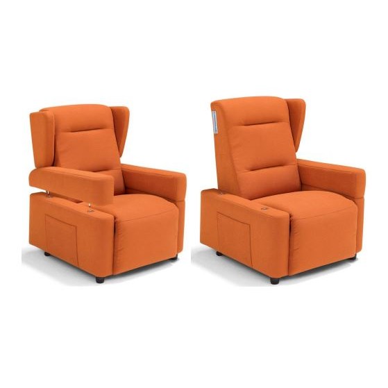 La poltrona è equipaggiata di serie con braccioli e orecchie schienale amovibili, doppia tavoletta che prolunga l’alza gambe.