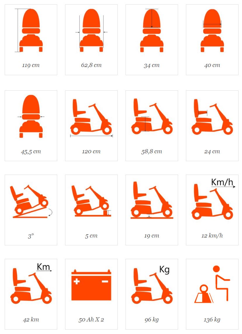 Scott è stabile ed affidabile. E’ dotato di cestino, specchietto sinistro, braccioli regolabili in altezza, batterie da 50 Ah per garantire una autonomia ottimale ed una velocità di 12 km/h.